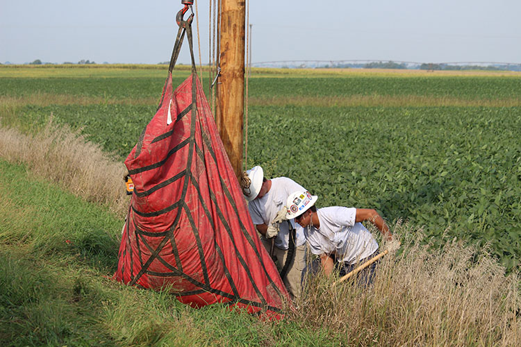 Ten OPPD apprentice line technicians spread out in three crews of three and one crew of four along a county road in Saunders County Monday morning. They eyed the job ahead: building a three-phase line near a nearby agribusiness facility.